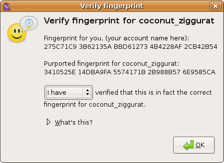 Now you can see what your fingerprint is, as well as the fingerprint of the person you are talking to. But you still don't know if the fingerprint really belongs to your friend or to an imposter. To find out, you need a way to check the fingerprint. A simple way to do this is to phone your friend and ask them to read you their fingerprint off of their screen, so that you can check it against what you see. If the values are the same, then you know that you are not talking to an imposter.